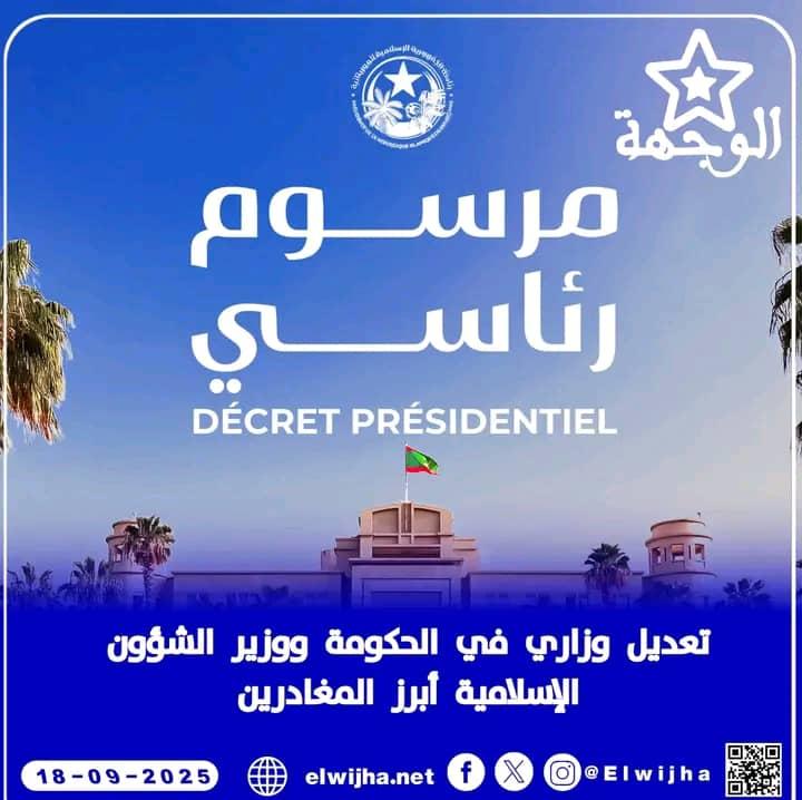 Sep 18 / التعليقات ولد بيه وزيرا مستشارا برئاسة الجمهورية أعلنت رئاسة الجمهورية أنه بموجب مرسوم صادر اليوم، تم تعيين السيد محمد محمود الشيخ عبد الله ولد بيه وزيرًا مستشارًا لدى رئاسة الجمهورية. خميس, 2025/09/18 - 21:39