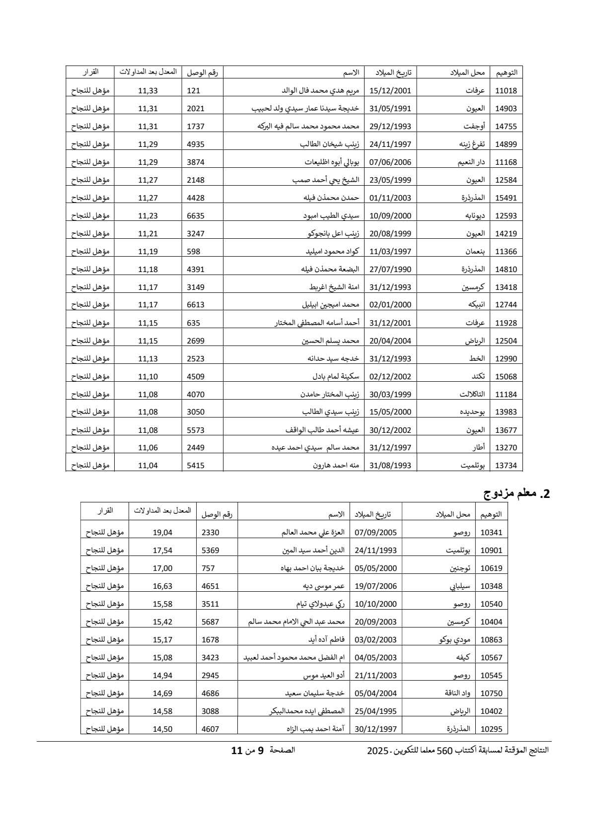 Nov 18 / التعليقات اللجنة الوطنية للمسابقات : تعلن نتائج 560 معلما(النتائج) أعلنت لجنة تحكيم المسابقة الخارجية لاكتتاب 560 معلماً عن النتائج الأولية، اليوم الثلاثا ثلاثاء, 2025/11/18 - 20:06