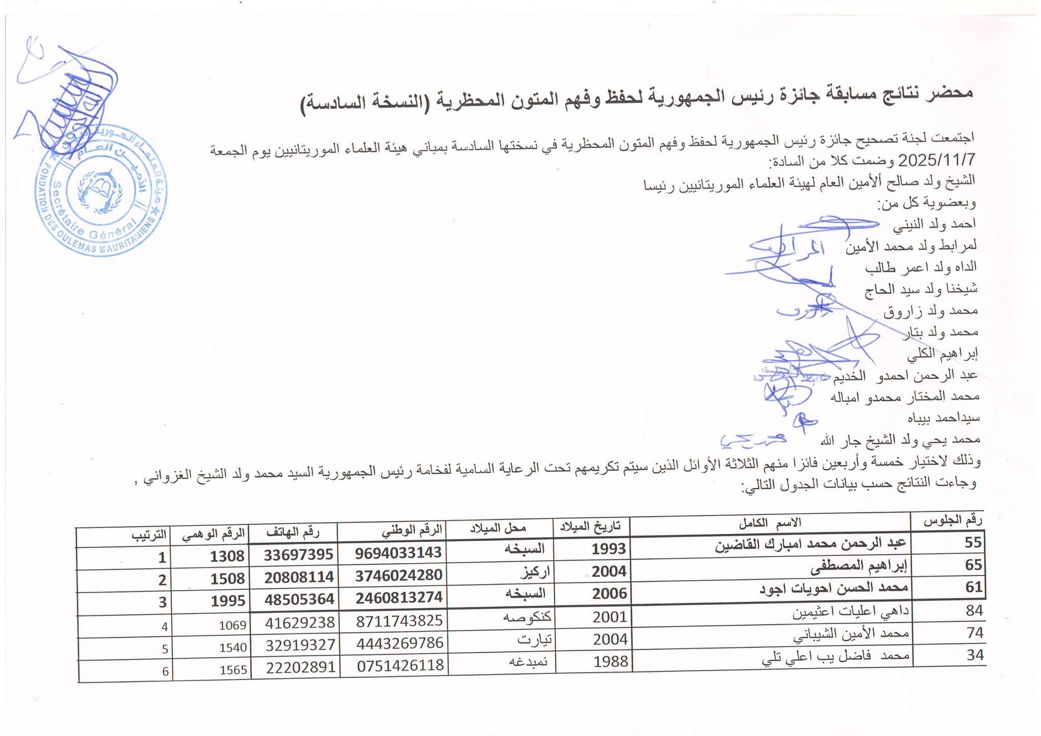 وبحسب المحضر الصادر عن اللجنة، عقدت لجنة الجائزة اجتماعها في السابع من نوفمبر الجاري بمقر هيئة العلماء الموريتانيين لاستكمال عملية التقييم واختيار الفائزين، كما تم نشر البيانات التفصيلية الخاصة بهم ضمن وثيقة النتائج الرسمية.