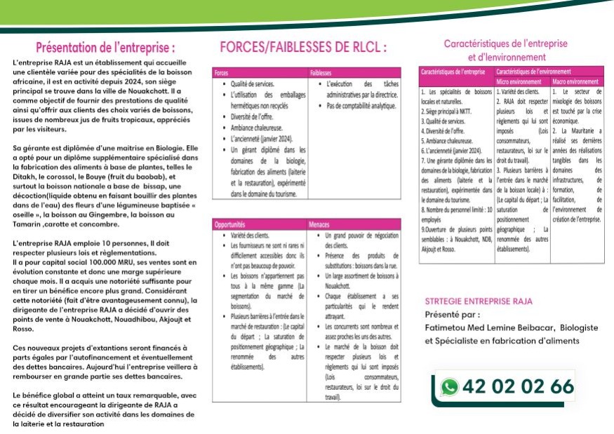 هذه المؤسسة تعكس تجربة البيولوجية ميمونة منت محمد لمين ابيبكر خريجة دراسات عليا؛أرادت ان تندب حظها معتمدة على قدرداتها الخاصة ورغم انها لا تزال في بداية الطريق ورغم شح المصادر وغياب الدعم فإن المعنية لا تزال متفائلة وإن كانت لما تستفيد يعد من مشاريع دعم الشباب وحسبنا ان نتمنى للسيدة النجاح في مشروعها.