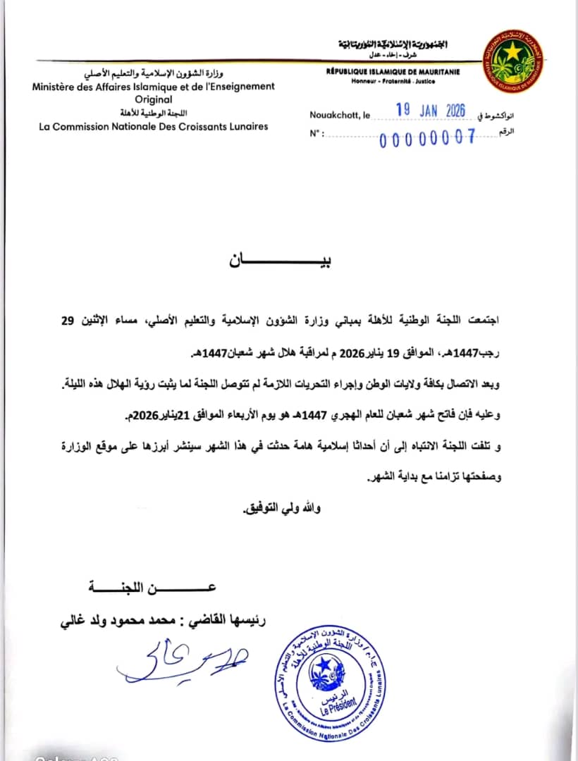 وبعد الاتصال بكافة ولايات الوطن وإجراء التحريات اللازمة لم تتوصل اللجنة لما يثبت رؤية الهلال هذه الليلة.