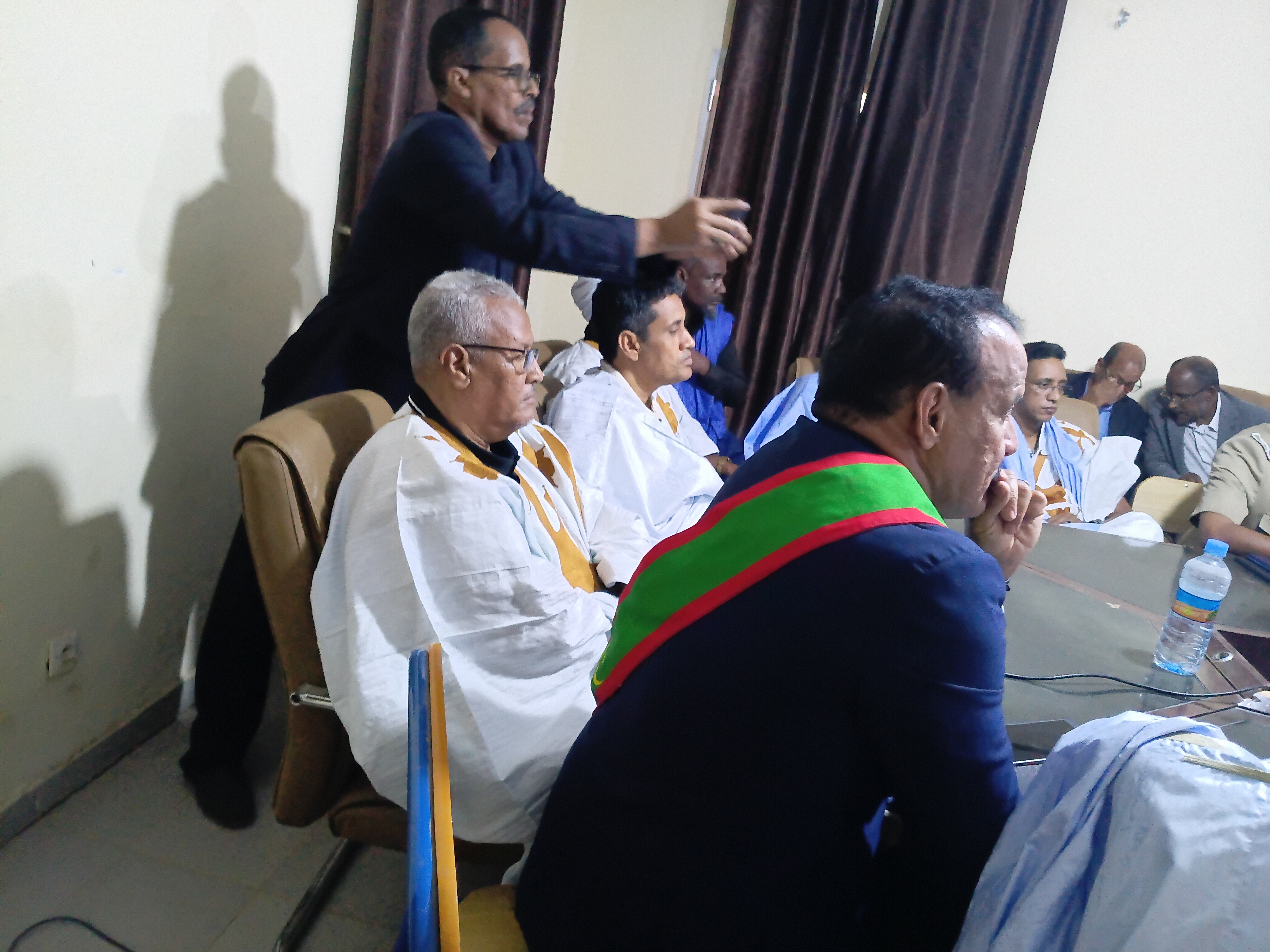 ثم اتاح الفرصة للتدخلات بدءا برئيس رابطة العمد عمدة اركيز السيد محمد ولد احمدوا الذي شكر الوالي على استحابته السريعة لهذا الإجتماع وطالب بإشراك العمد في اي عمل في هذا الصدد ووعد بالتعاون والتكامل مع الإدارة.