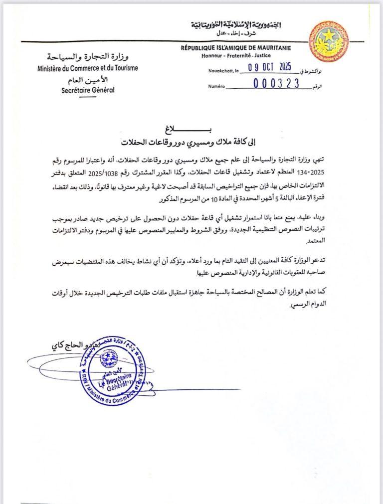 أعلنت وزارة التجارة والسياحة أن جميع التراخيص السابقة لتشغيل دور وقاعات الحفلات أصبحت لاغية وغير قانونية، خاصة بعد انتهاء فترة الإعفاء المحددة بخمسة أشهر، وذلك بموجب المرسوم رقم 134-2025 والمقرر المشترك رقم 2025/1038 المتعلقين بتنظيم القطاع.