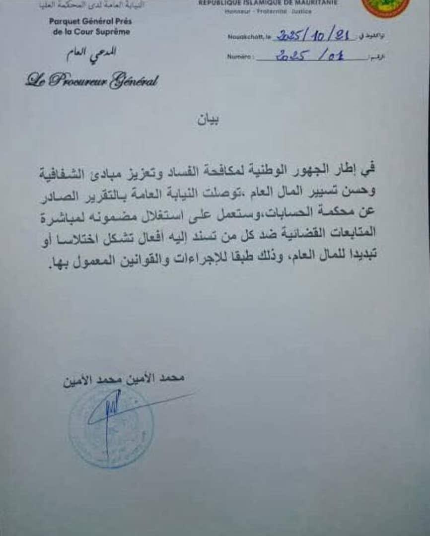 في إطار الجهود الوطنية لمكافحة الفساد وتعزيز مبادئ الشفافية وحسن تسيير المال العام ،توصلت النيابة العامة بالتقرير الصادر عن محكمة الحسابات، وستعمل على استغلال مضمونه لمباشرة المتابعات القضائية ضد كل من تسند إليه أفعال تشكل اختلاسا أو تبديدا للمال العام، وذلك طبقا للإجراءات والقوانين المعمول بها.