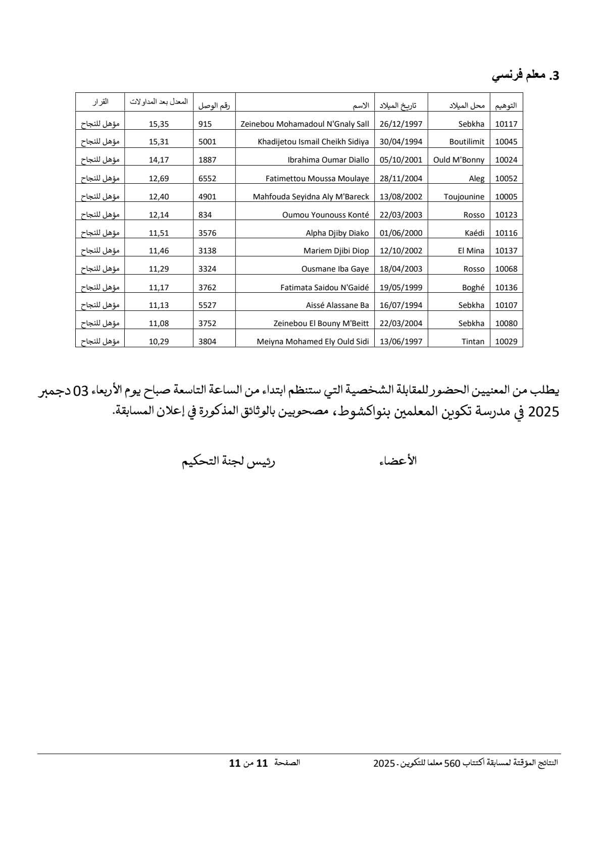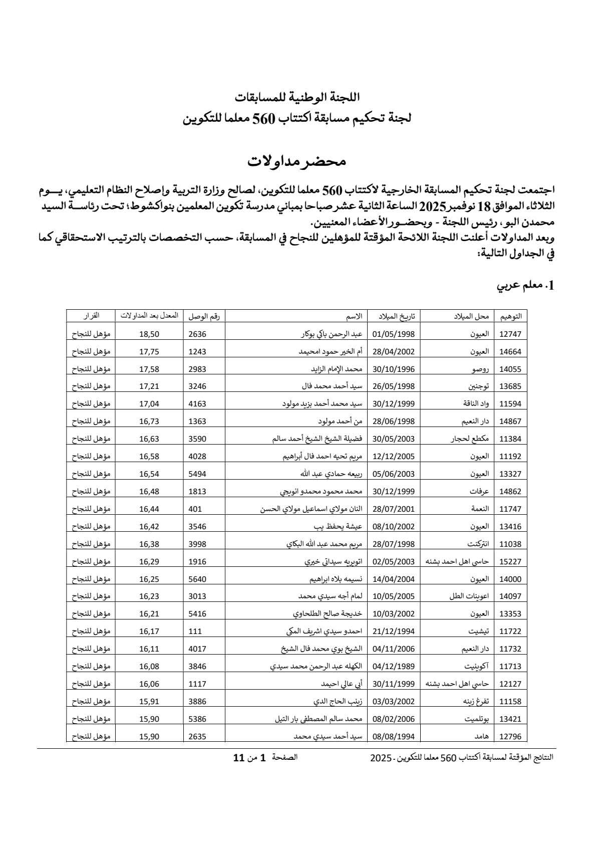 Nov 18 / التعليقات اللجنة الوطنية للمسابقات : تعلن نتائج 560 معلما(النتائج) أعلنت لجنة تحكيم المسابقة الخارجية لاكتتاب 560 معلماً عن النتائج الأولية، اليوم الثلاثا ثلاثاء, 2025/11/18 - 20:06