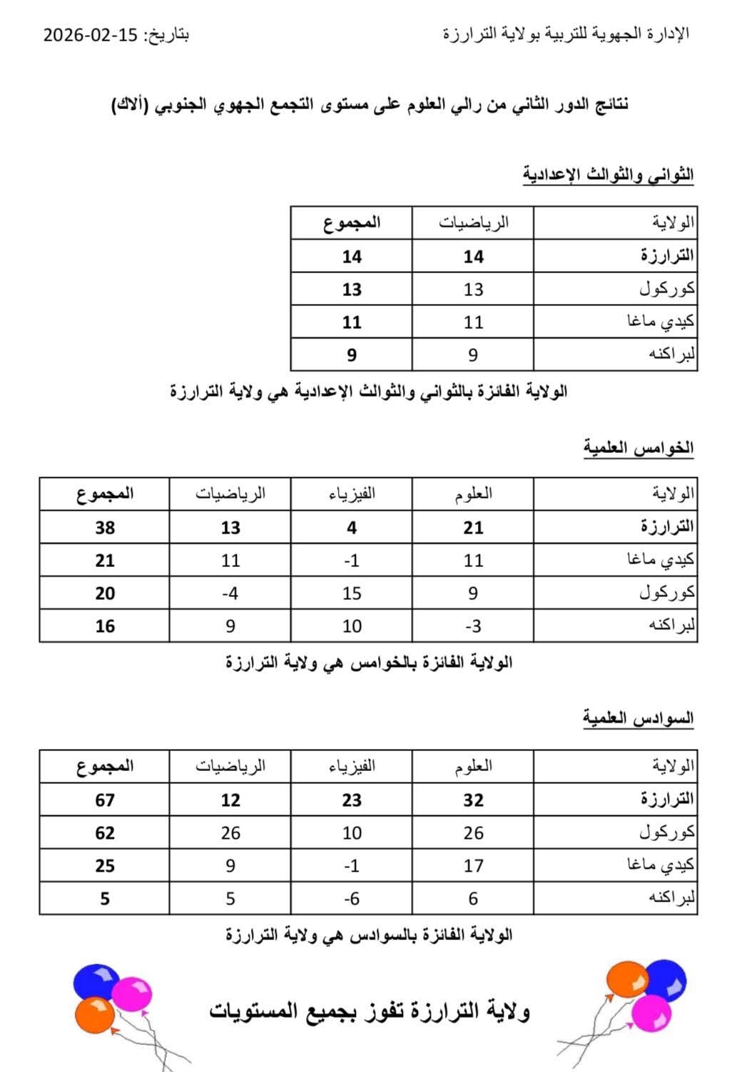 ففي فئة الثواني والثوالث الإعدادية في مادة الرياضيات، حصد فريق الترارزة 14 نقطة، متقدما على ولايات كوركول وكيدي ماغه ولبراكنه.