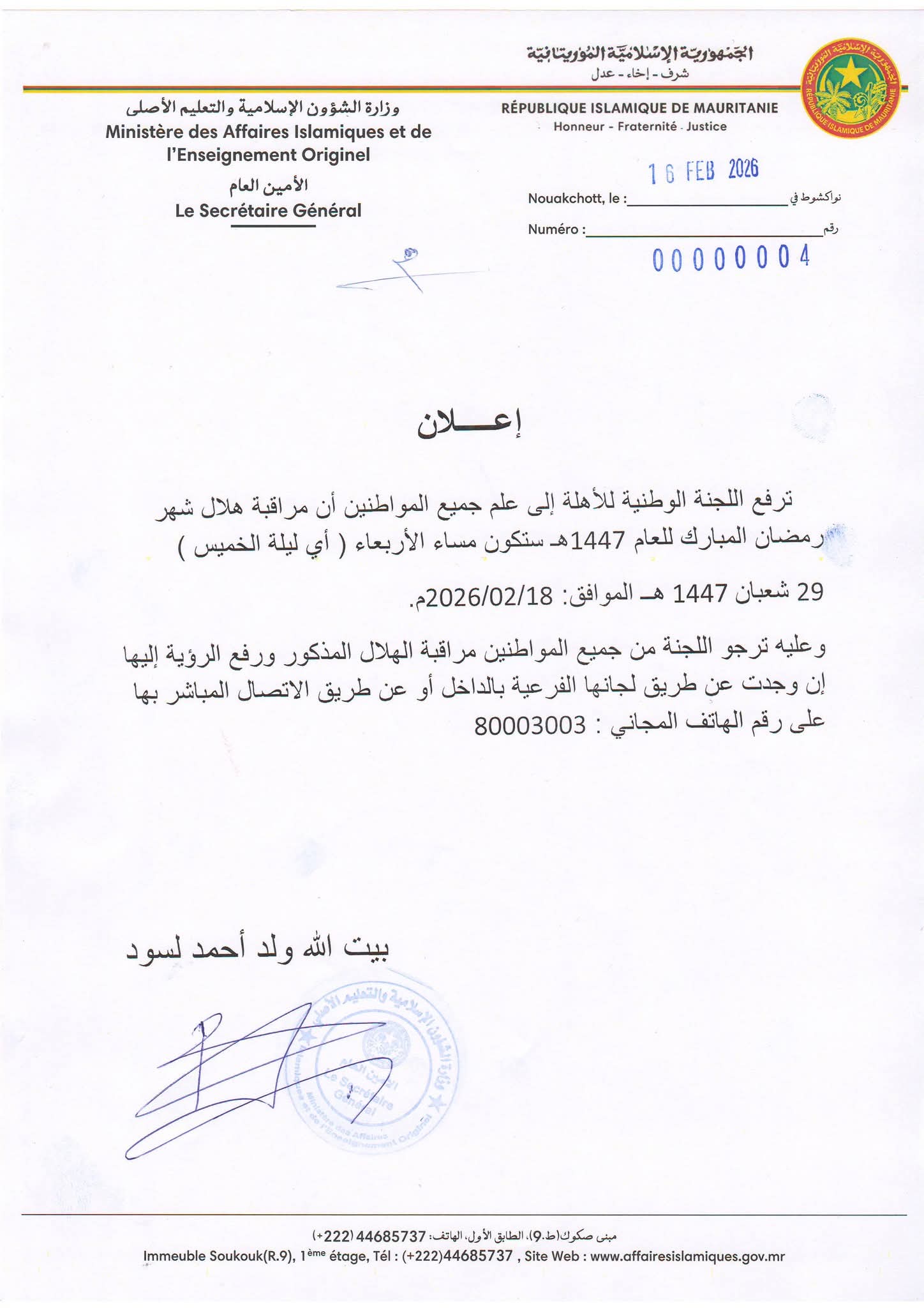 ترفع اللجنة الوطنية للأهلة إلى علم جميع المواطنين أن مراقبة هلال شهر رمضان المبارك للعام 1447هـ ستكون مساء الأربعاء ( أي ليلة الخميس )