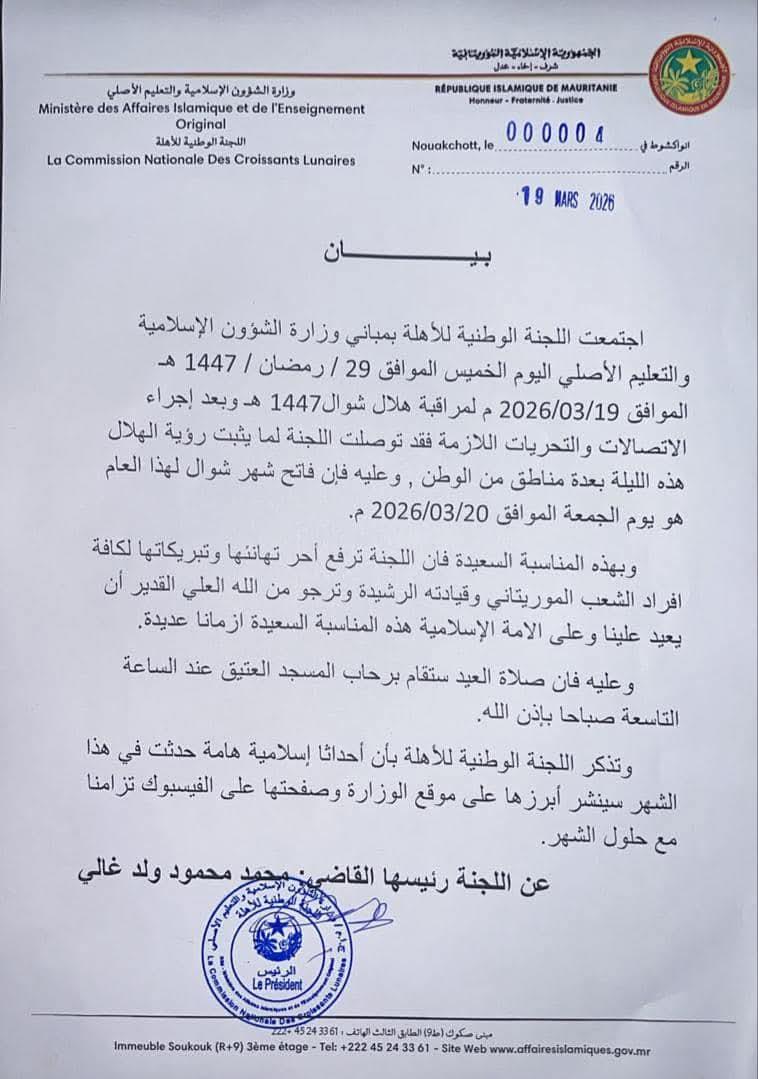 أعلنت اللجنة المركزية للأهلة أن يوم غدٍ الجمعة سيكون أول أيام عيد الفطر المبارك في موريتانيا، وذلك بعد ثبوت رؤية هلال شهر شوال مساء اليوم الخميس.