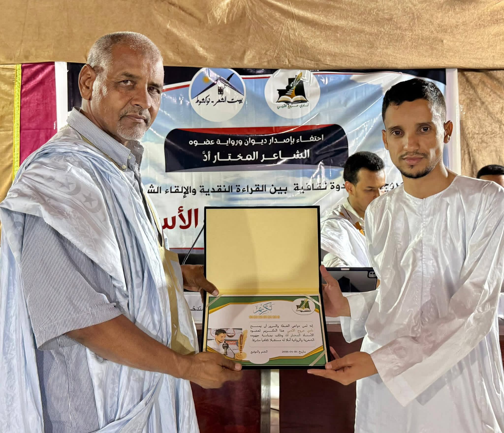 احتضن بيت الشعر-نواكشوط مساء السبت 18 أبريل 2026، نشاطا ثقافياً نظمه نادي عروج الأدبي، احتفاءً بصدور المولودين الأدبيين الجديدين لعضو النادي الشاعر والروائي المميز الأستاذ المختار ولد أحمد ولد أد ، والمتمثلين في ديوان شعري بعنوان "فيما أرى" ورواية بعنوان " ما وراء السنين"، وقد أدار الأمسية الشاعر محمد المصطفى العربي وسط حضور نخبوي من المثقفين والشباب المبدعين.