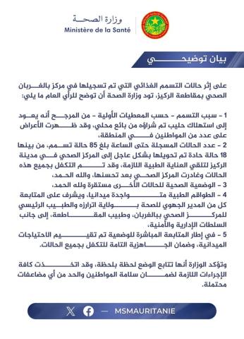على إثر حالات التسمم الغذائي التي تم تسجيلها في مركز بالغربان الصحي بمقاطعة الركيز، تود وزارة الصحة أن توضح للرأي العام ما يلي: