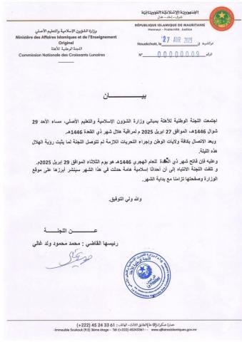 اجتمعت اللجنة المركزية لمراقبة الأهلة بمقرها بوزارة الشؤون الإسلامية والتعليم الأصلي، مساء الأحد29 شوال 1446هـ، الموافق 27/04/2025م لمراقبة هلال ذي القعدة من سنة 1446هـ، وبعد تحرى اللجنة واتصالاتها بكافة ولايات الوطن لم تتوصل بما يثبت رؤية الهلال هذه الليلة.