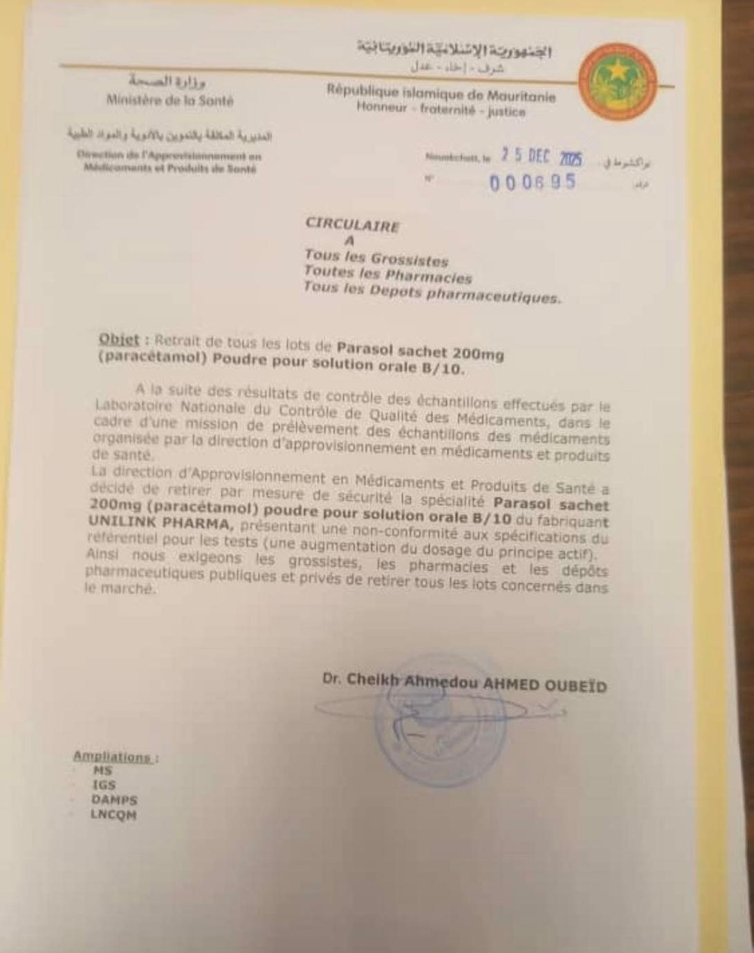 على إثر نتائج مراقبة العينات التي أجراها المختبر الوطني لمراقبة جودة الأدوية، وذلك في إطار مهمة أخذ عينات من الأدوية المنظمة من طرف مديرية التموين بالأدوية والمنتجات الصحية، قررت مديرية التموين بالأدوية والمنتجات الصحية، كإجراء احترازي، سحب Parasol أكياس 200 ملغ مسحوق لتحضير محلول فموي B/10 (باراسيتامول) ،من إنتاج شركة UNILINK PHARMA، وذلك بسبب عدم مطابقة هذا الدواء للمواصفات المرجعية المعتمدة في الاختبارات (زيادة في جرعة المادة الفعالة).